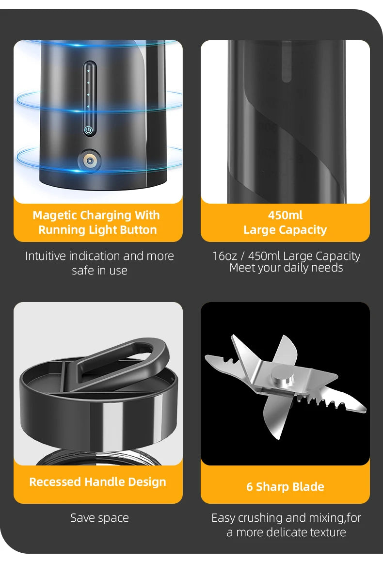 Equipped with high-speed stainless steel blades and a durable motor, it effortlessly crushes fruits, vegetables, and ice to create smooth, nutrient-packed drinks in seconds. Its rechargeable battery ensures portability, while the lightweight design makes it easy to carry in your bag or backpack.